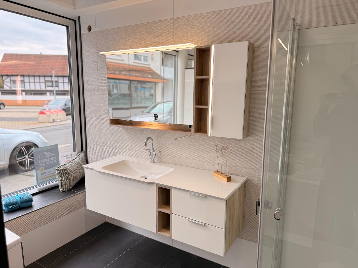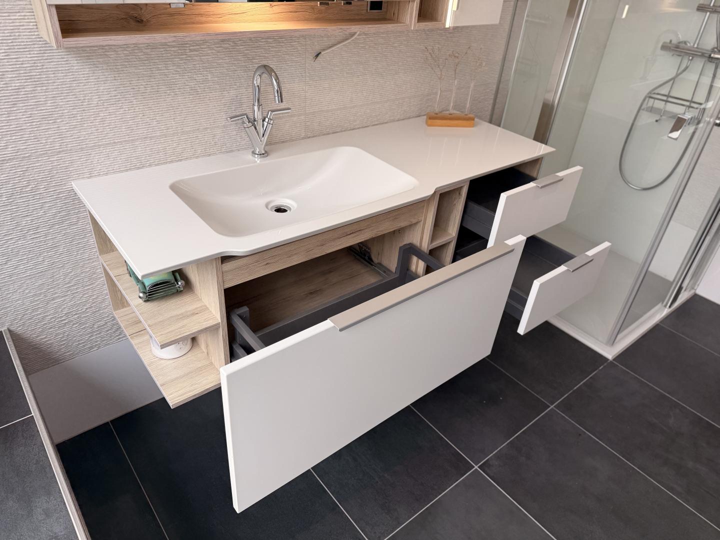 Bestandteile: Waschtischunterschrank mit Schubladen und offenen Fächern, Waschtischplatte mit integriertem Waschbecken, beleuchteter Spiegelschrank.