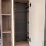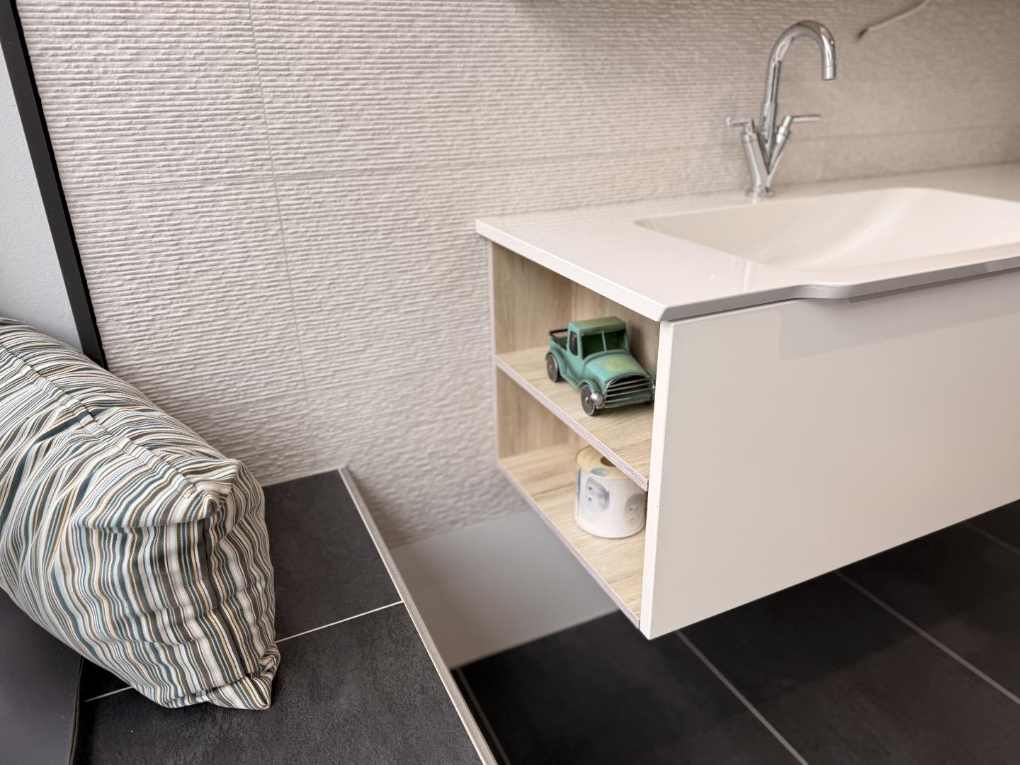 Das Set zeichnet sich durch seinen Waschtischunterschrank aus, der eine weiße Front mit Akzenten in heller Holzoptik kombiniert. Die breite Mineralguss-Waschtischplatte beherbergt ein großzügiges, integriertes Waschbecken. Praktische offene Fächer neben Schubladen bieten Platz für dekorative oder schnell zugängliche Gegenstände.