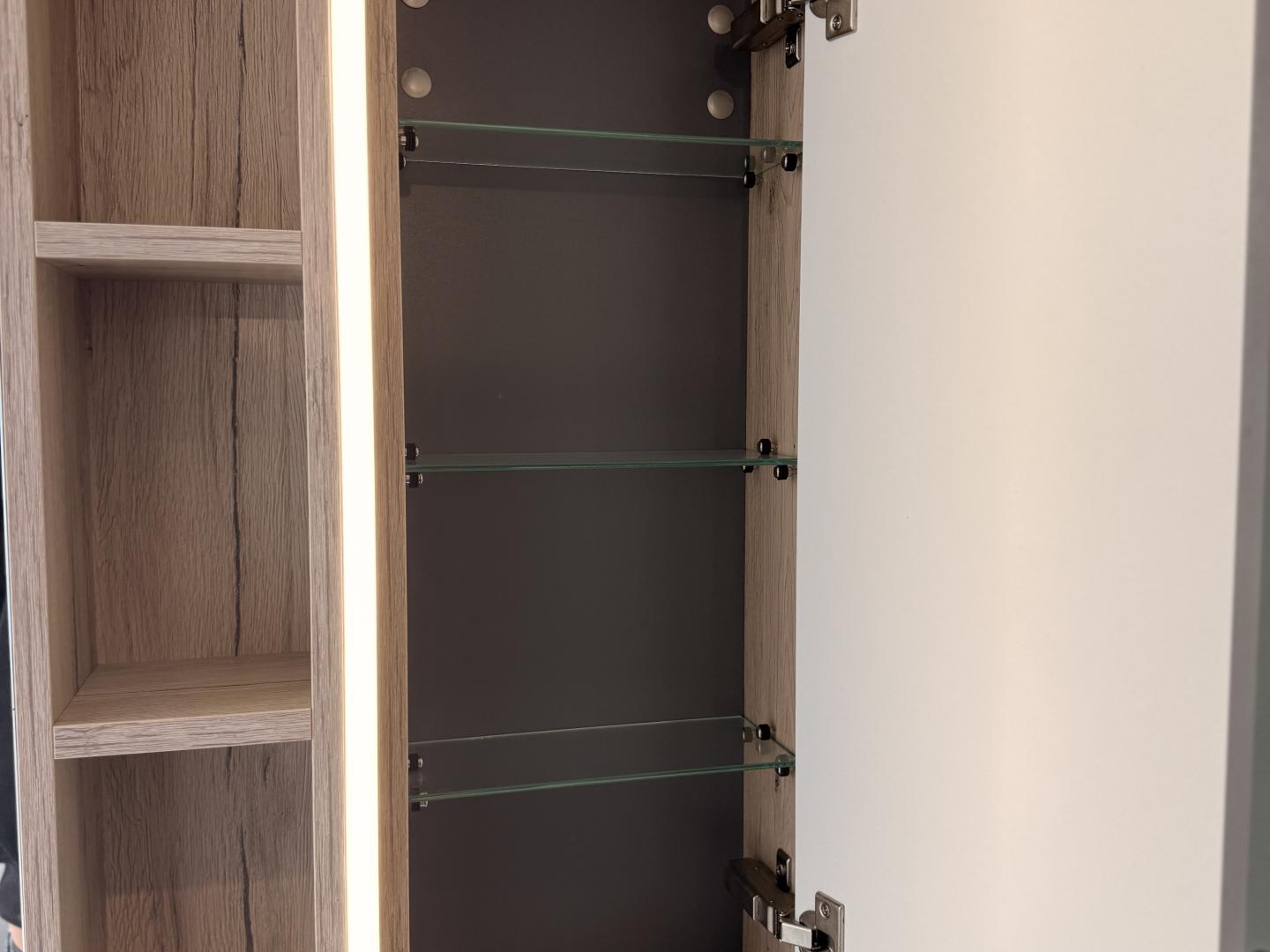 Der passende Spiegelschrank ist das Highlight: Er verfügt über eine integrierte Beleuchtung (oben und seitlich), die für optimale Lichtverhältnisse beim Styling sorgt und eine gemütliche Atmosphäre schafft. Im Inneren bietet er viel Stauraum.