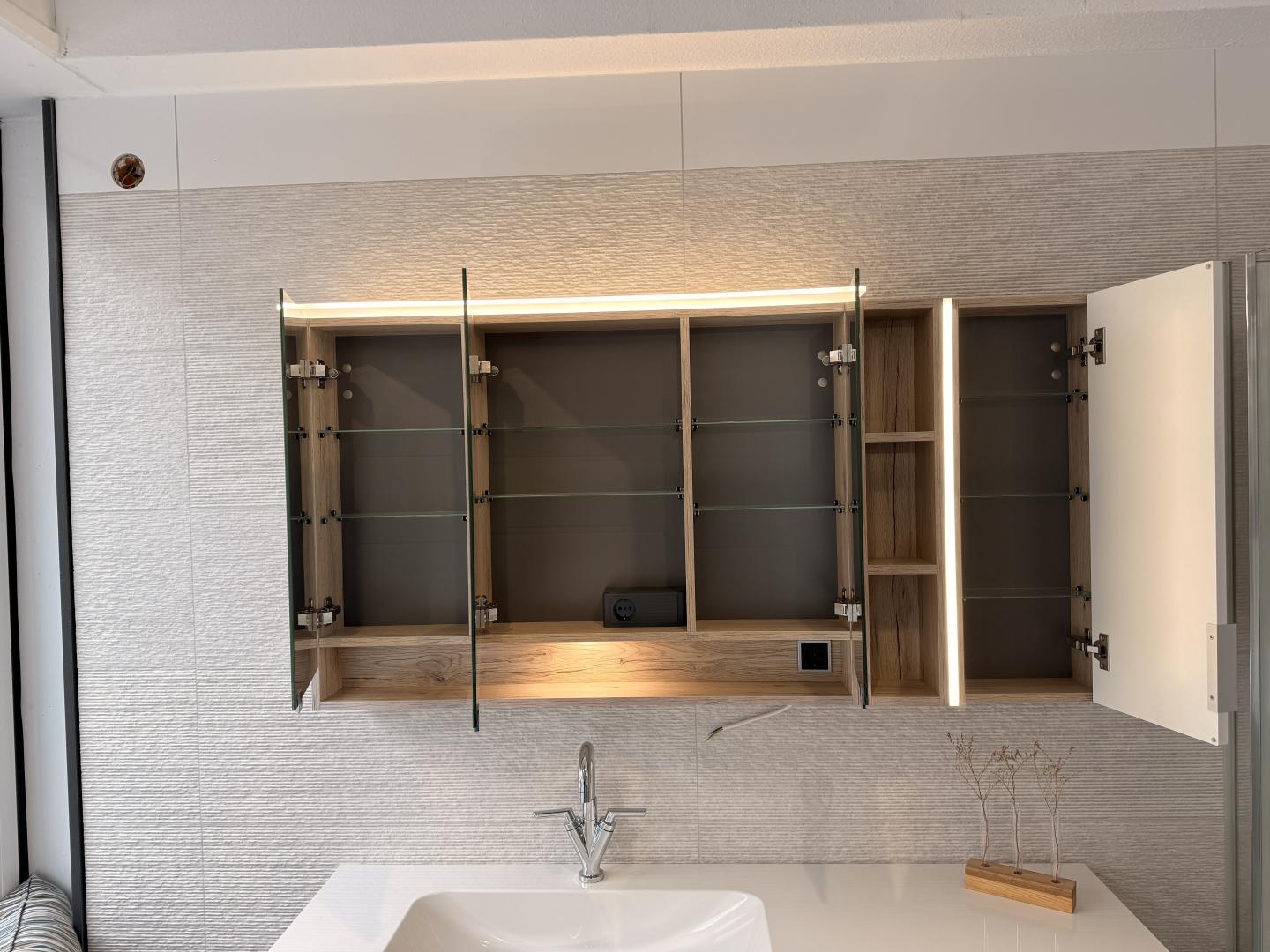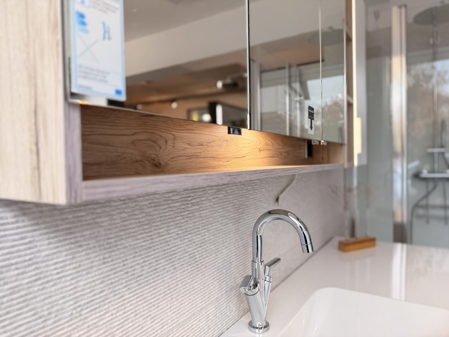 Besonderheit: Hochwertiger Spiegelschrank mit integrierter Beleuchtung.