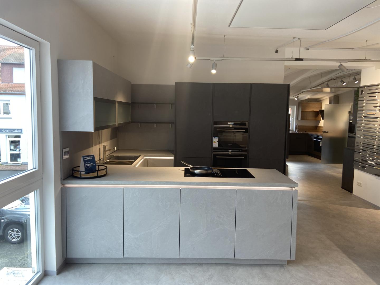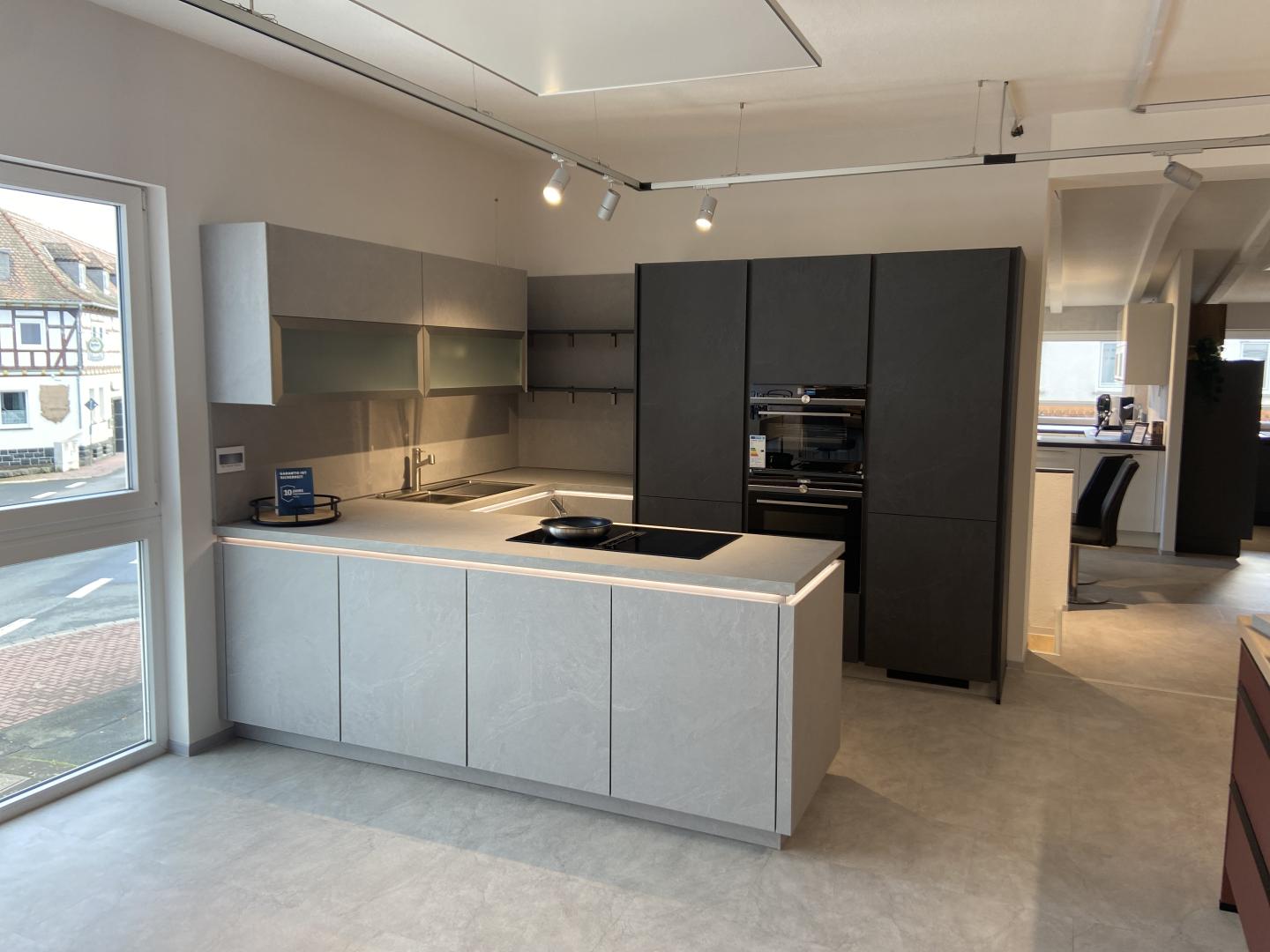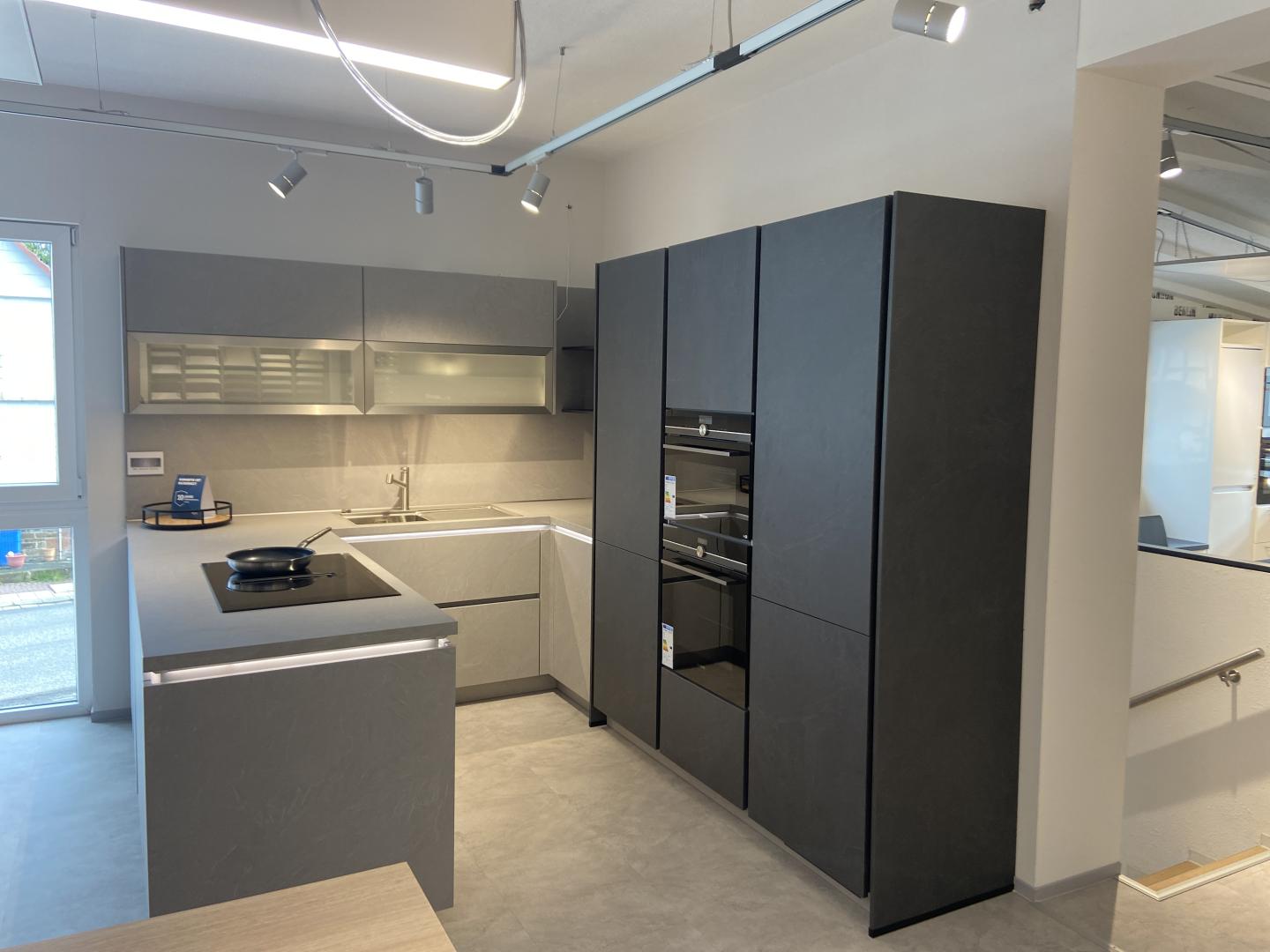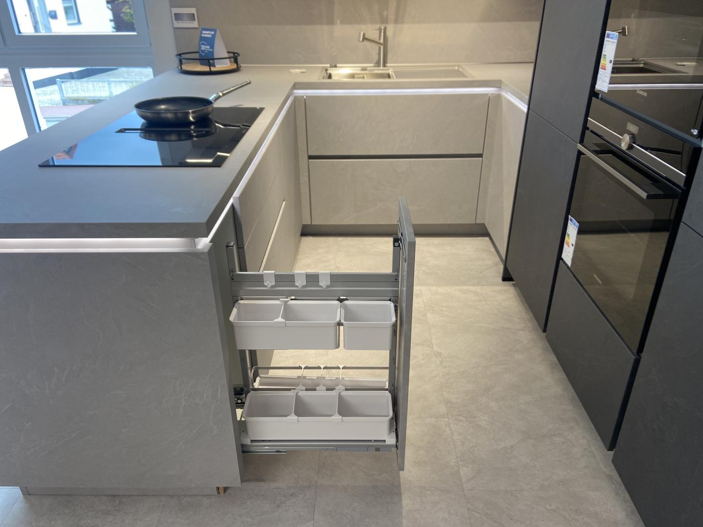 Diese moderne Küche besticht durch ihr modernes Design und die hochwertigen Materialien. Die Kombination aus hellem Grau und dunklem Anthrazit verleiht dem Raum eine elegante Atmosphäre. Die Kochinsel ist nicht nur ein optisches Highlight, sondern bietet auch zusätzlichen Arbeits- und Stauraum. Die indirekte Beleuchtung unter den Hängeschränken und unter der Arbeitsplatte setzen gezielt Akzente und schaffen eine angenehme Arbeitsatmosphäre.