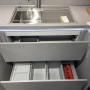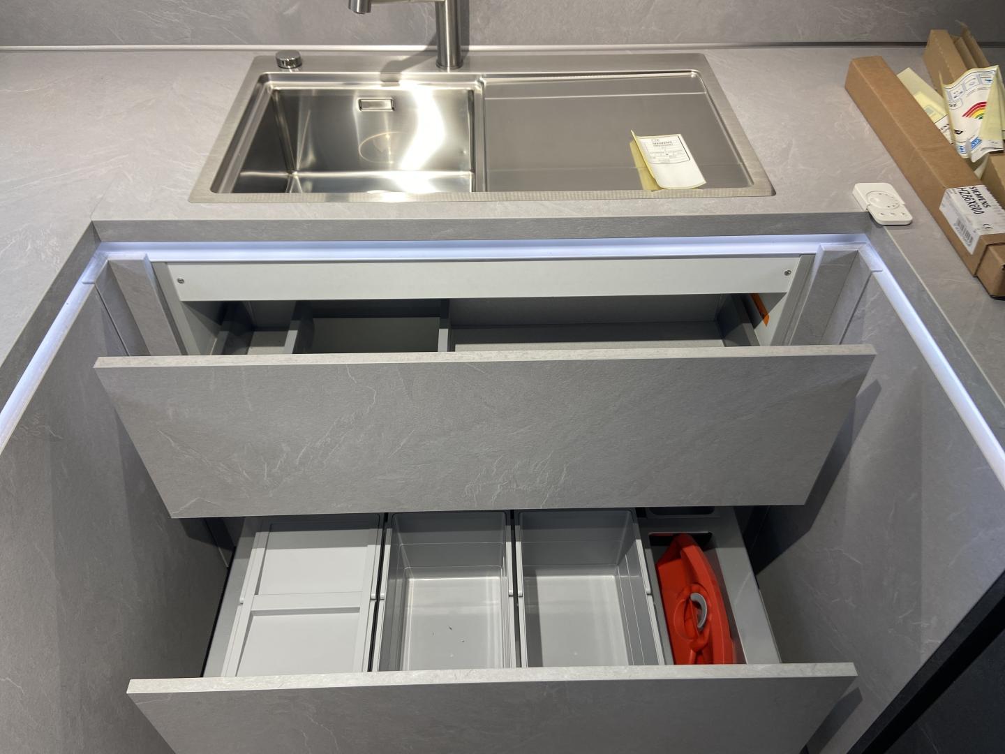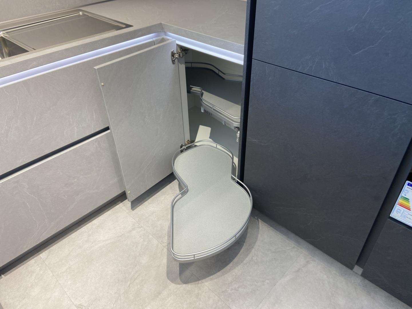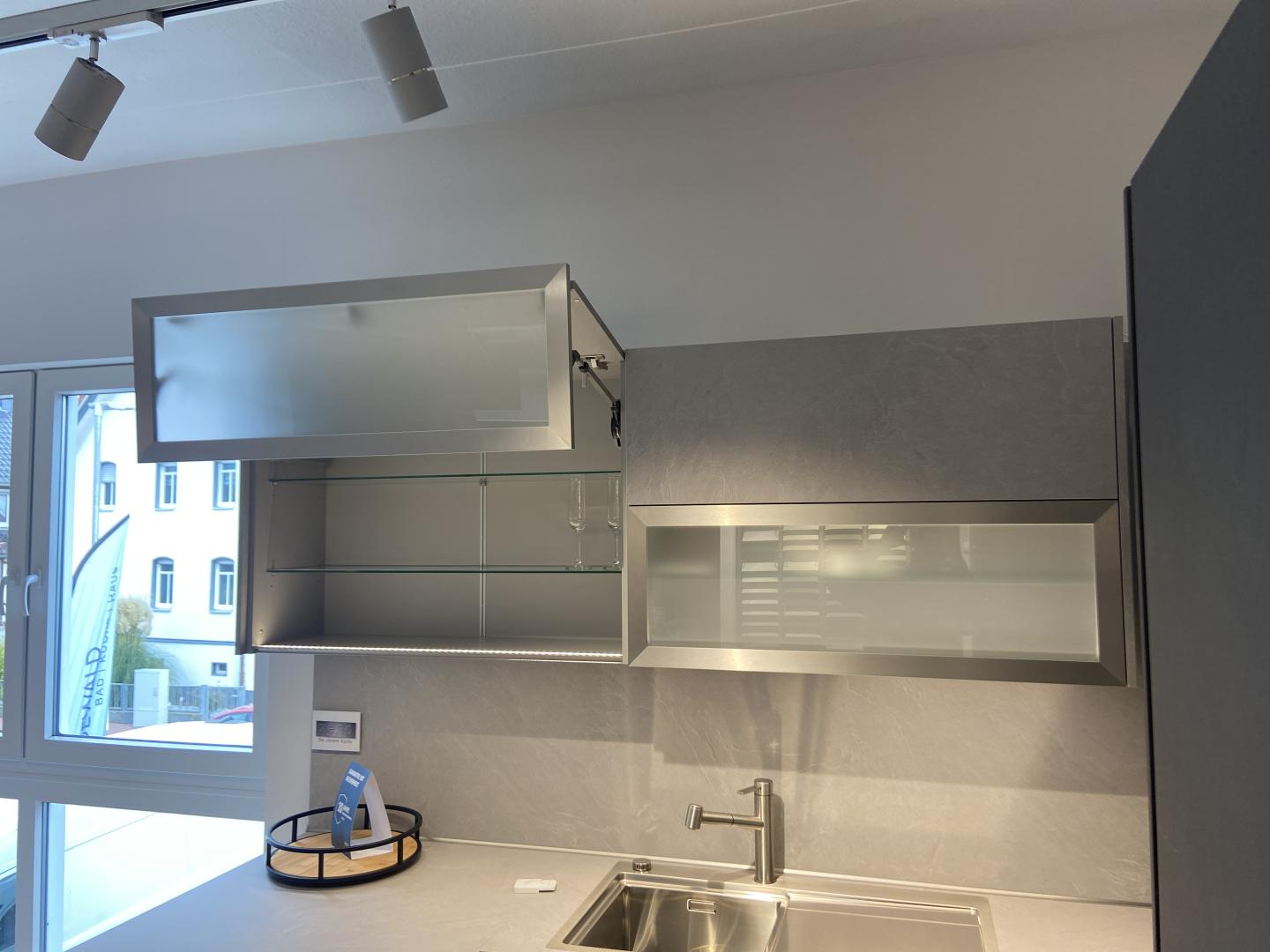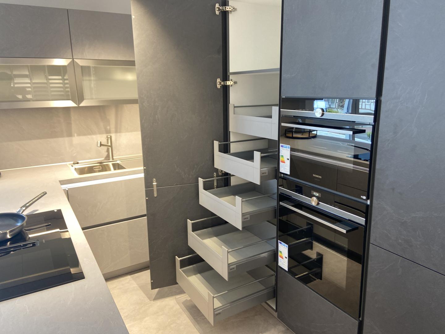 Diese moderne Küche besticht durch ihr modernes Design und die hochwertigen Materialien. Die Kombination aus hellem Grau und dunklem Anthrazit verleiht dem Raum eine elegante Atmosphäre. Die Kochinsel ist nicht nur ein optisches Highlight, sondern bietet auch zusätzlichen Arbeits- und Stauraum. Die indirekte Beleuchtung unter den Hängeschränken und unter der Arbeitsplatte setzen gezielt Akzente und schaffen eine angenehme Arbeitsatmosphäre.