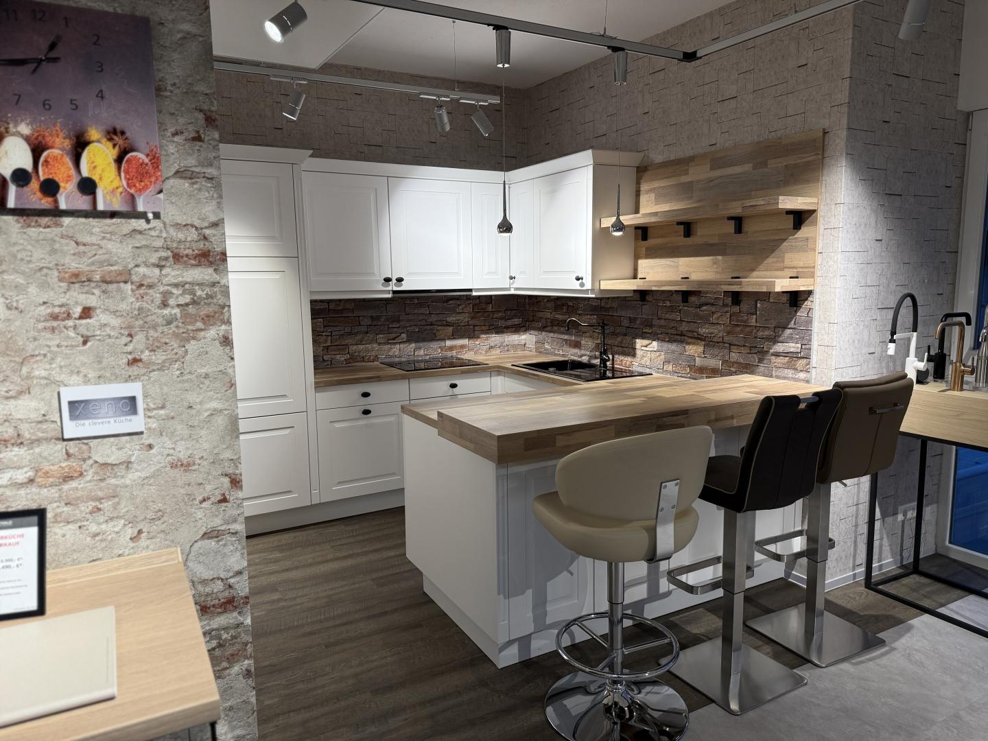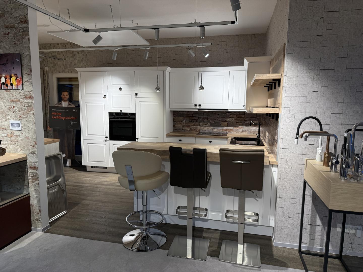 Ausgestattet mit hochwertigen Elektrogeräten, Spüle und Armatur, bietet diese Musterküche alles, was Sie für den täglichen Gebrauch benötigen. Ideal für alle, die Qualität, Stil und ein harmonisches Gesamtbild schätzen.