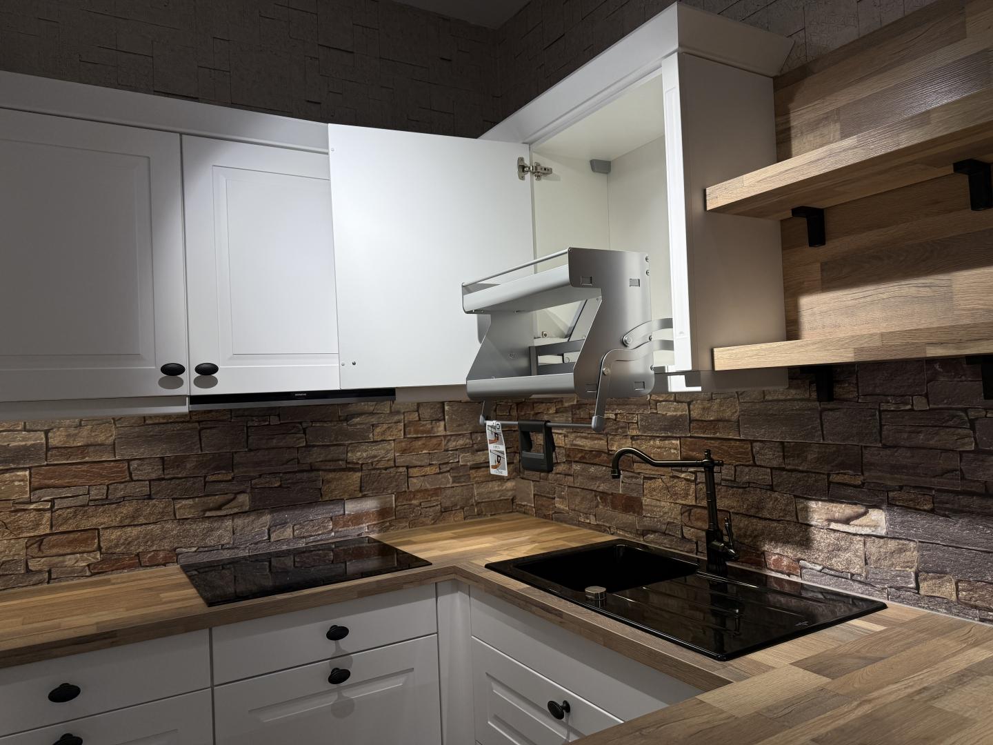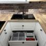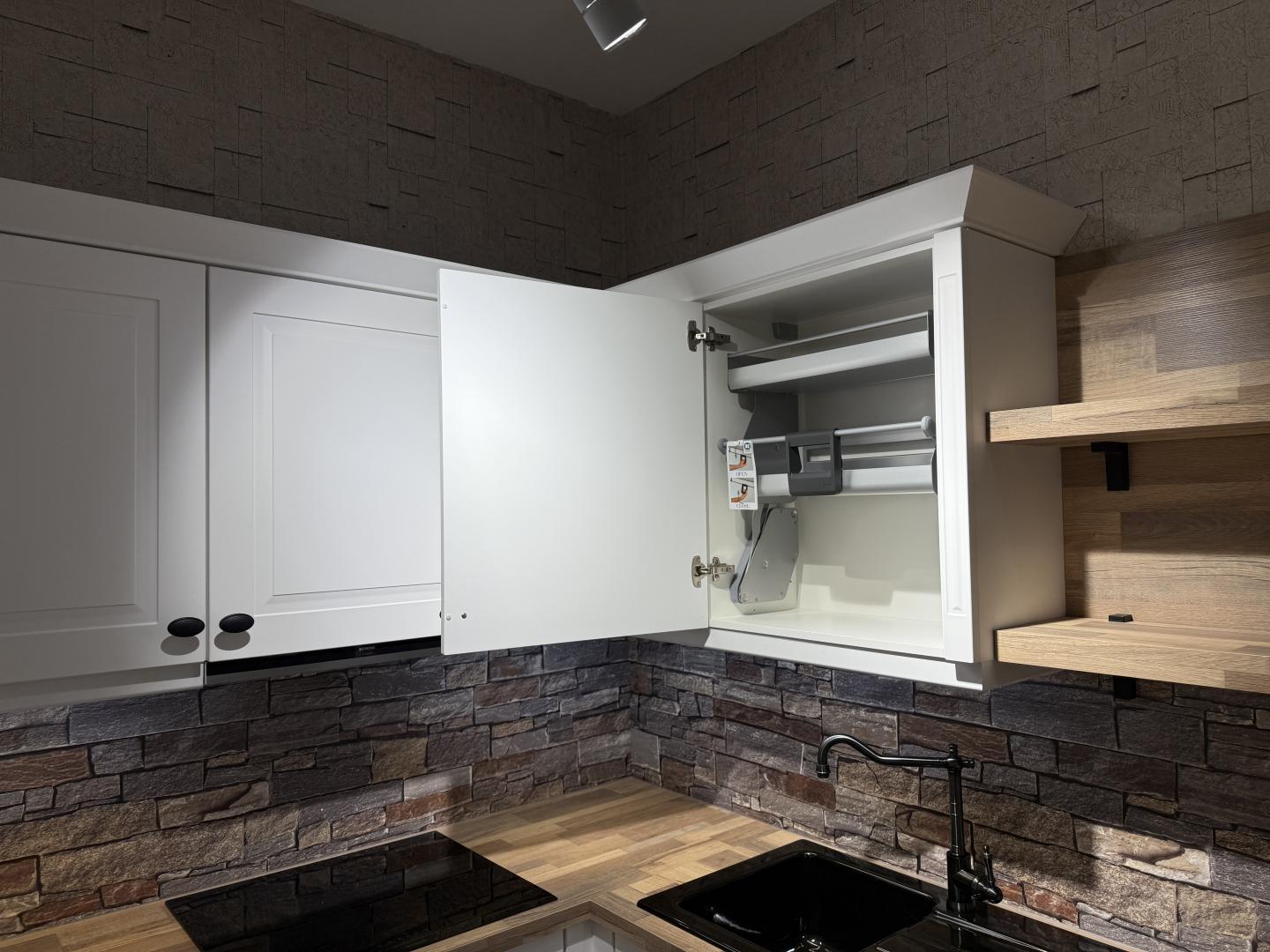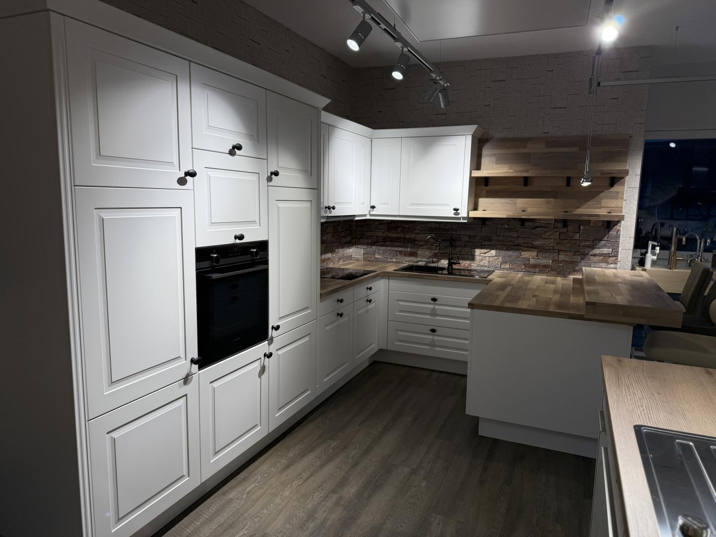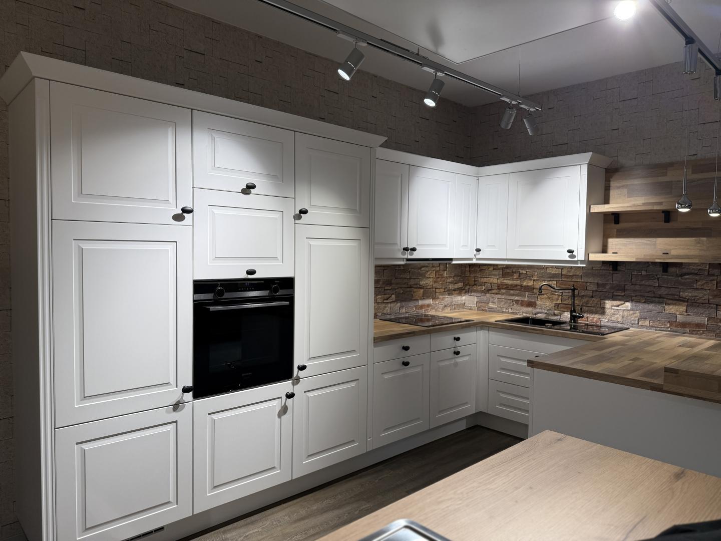 Diese wunderschöne Einbauküche im klassischen Landhausstil verbindet zeitloses Design mit moderner Funktionalität. Die weißen Fronten mit edlen Kassettenrahmen und die Holzarbeitsplatte verleihen der Küche eine warme, gemütliche Ausstrahlung.