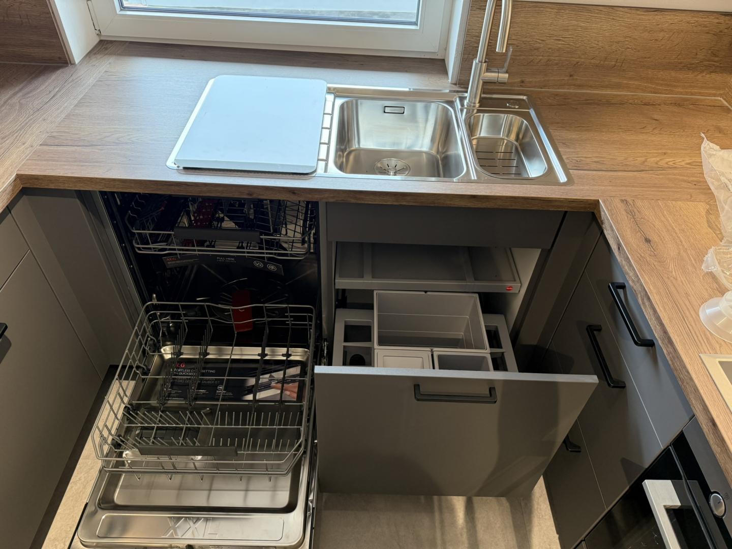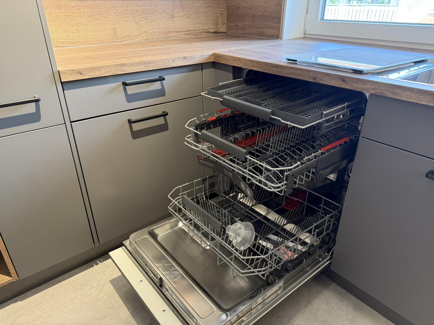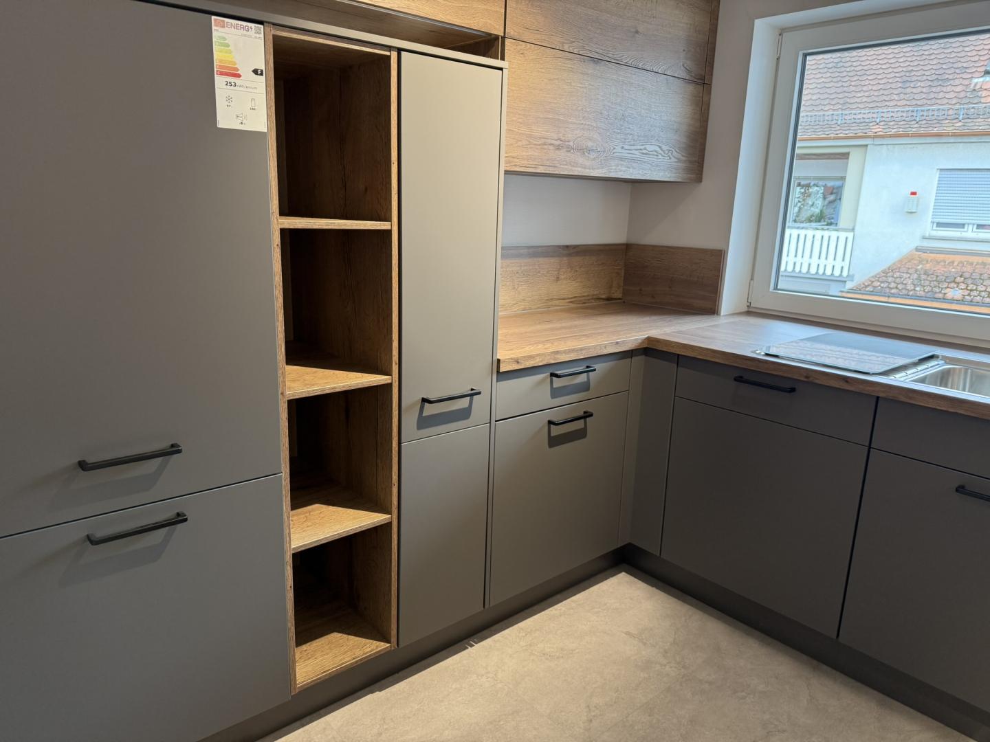 Zum Verkauf steht eine stilvolle, moderne Einbauküche in U- Form mit hochwertiger Ausstattung und viel Stauraum. Die Küche überzeugt durch ihre elegantes Design in Anthrazit mit warmen Holz- Akzenten und bietet sowohl funktional, als auch optisch ein echtes Highlight für jedes Zuhause.